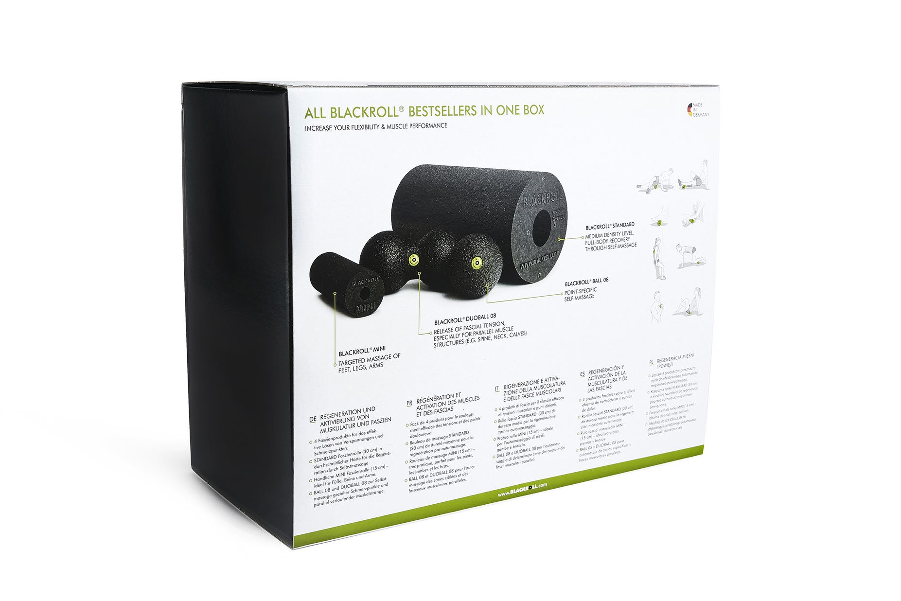 Das BLACKROLL® BLACKBOX Faszienrollen-Set ist ein echter Bestseller. Es enthält die beliebtesten Produkte von BLACKROLL®, die sich für die Behandlung muskulärer und myofaszialer Verspannungen eignen. Die BLACKROLL® STANDARD Faszienrolle ist ein hochwirksames Massagetool, mit dem man Muskeln, insbesondere den Rücken, das Gesäß und die Beine, großflächig behandeln kannst. Kleinere Muskelgruppen, darunter die Füße, die Waden und die Arme, therapierst man am besten mit der BLACKROLL MINI, deren Handhabung besonders einfach ist. Außerdem sind in dem BLACKROLL® BLACKBOX SET der BLACKROLL® BALL 08 Faszienball und der BLACKROLL® DUOBALL 08 Faszienball enthalten, um die Muskeln punktuell zu behandeln. Insbesondere Triggerpunkte, die für lokale und ausstrahlende Schmerzen verantwortlich sind. Der BLACKROLL® DUOBALL 08 Faszienball übernimmt diesbezüglich eine ganz besondere Aufgabe: Er wurde extra für die Selbstmassage der Wirbelsäule entwickelt, um die Dornfortsätze auszusparen. Mit einem Durchmesser von 8 cm ist er zudem klein und handlich, sodass er sich selbst für die Behandlung des Nackens und der Achillessehne eignet.